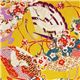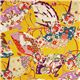by CosmoYellow Fan Fabric by Quilt Gate. yellow cotton sheeting fabric with fan pattern, with cranes, cherry blossoms, ribbon, bells etc., with metallic gold embellishment