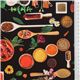 Floral and Food Fabric by Kokka. black cotton fabric with daisies, pepper, tea, cloves, garlic, sunflowers, cutting board, spoons etc.