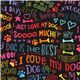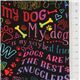 by Timeless TreasuresDog Phrases Fabric by Timeless Treasures. black fabric with rainbow color text such as "I love my dog", "my dog is cool" etc., with bones, paw prints etc.