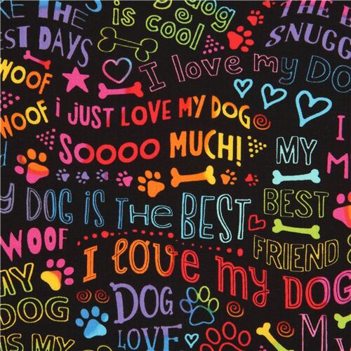 Dog Phrases Fabric by Timeless Treasures. black fabric with rainbow color text such as "I love my dog", "my dog is cool" etc., with bones, paw prints etc.