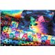 Multicolor Paw Fabric by Timeless Treasures. black fabric with colorful paw prints in green, blue, yellow, orange etc.