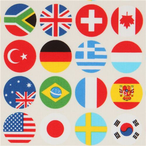 by CosmoCream Flag Badge Fabric by Cosmo. cream cotton sheeting fabric with circles with flags of various countries such as Japan, South Korea, the USA, Canada, South Africa etc.