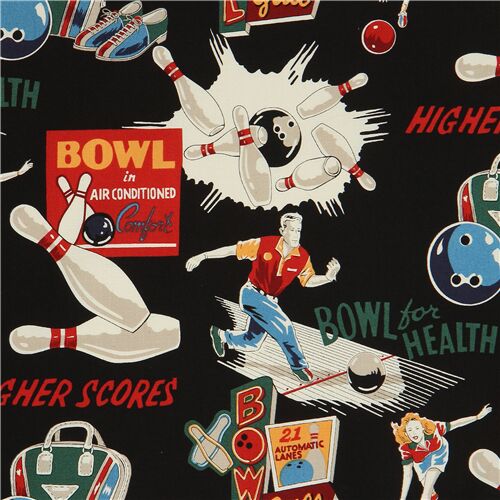 Black Bowling Fabric. black fabric with bowling pins, people, bowling alley signs etc.