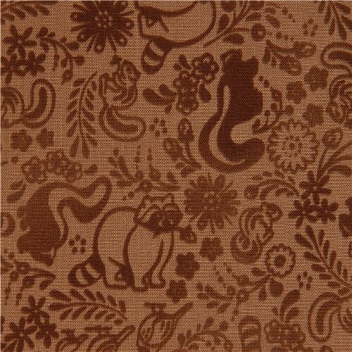 by Robert KaufmanBrown Woodland Animal Fabric by Robert Kaufman. brown cotton fabric with raccoons, skunks, birds etc., with flowers, leaves