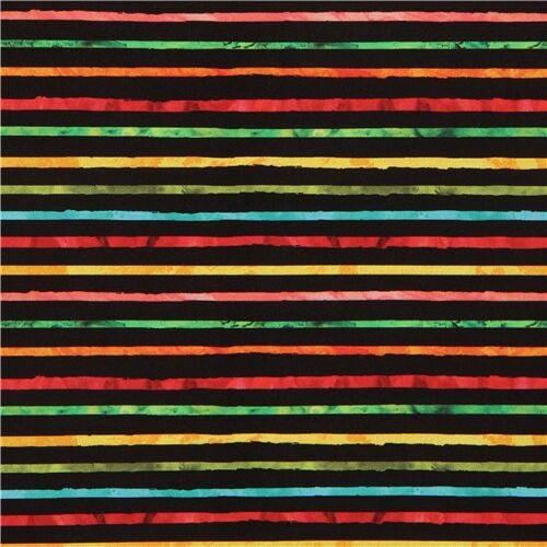 by Robert KaufmanBlack Multi Color Stripes by Robert Kaufman Fabric. cotton black background with orange red green yellow blue stripes
