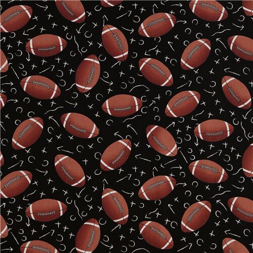 Brown Balls Sports Fabric by Timeless Treasures. black cotton fabric with tossed American football brown elongated balls and tiny white chalk signs and marks