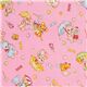 Cotton Fabric with Kawaii Animals on Pink. cotton sheeting children fabric with cute animals under umbrellas and colorful candy on peach pink; mouse, kitten, bear etc.