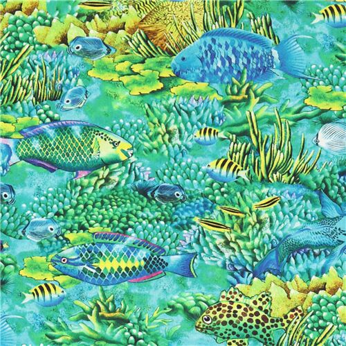 Robert Kaufman packed blue green yellow reef sea life fabric Fabric