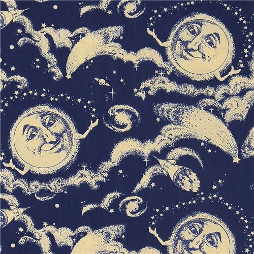 7,26 Vintage blue space fabric moon face galaxy rocket star white Fabric by Japanese Indie - modes4u