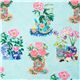 by Quilting TreasuresMulticolor Flower Bouquets Fabric. Cute kitsch floral print featuring detailed multicolor flower bouquets with peonies, roses etc. in shades of pink, green and other colors, arranged in Chinese style vases and ornate teapots, with tiny glasses, fruits etc. onto a light blue background very high quality fabric, typical great quality from the USA