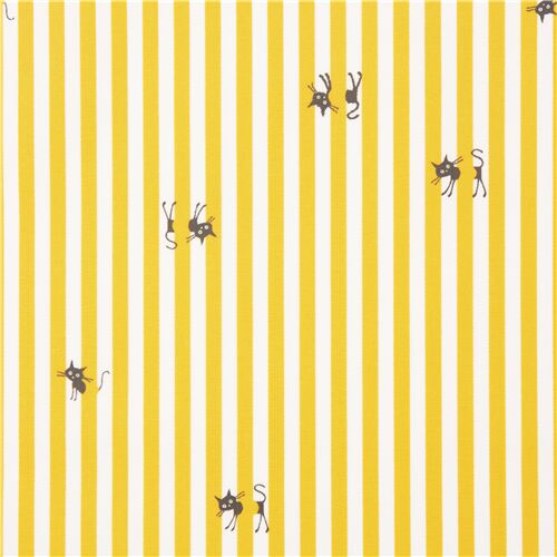 Cats Laminated Fabric from Japan. white and yellow striped laminated printed Oxford fabric with tiny black cats hiding behind stripes specially imported from Japan from small makers, 100% cotton plus PVC coating very well made fabric, typical perfect Japanese quality