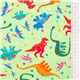 Dinosaur Party Green Fabric by Michael Miller. funny kids' fabric with multicolor T-Rex, stegosaurus, triceratops etc., in orange, dark blue, yellow and more, tossed onto light green background fabric from the US, 100% cotton, good quality as usual from Michael Miller
