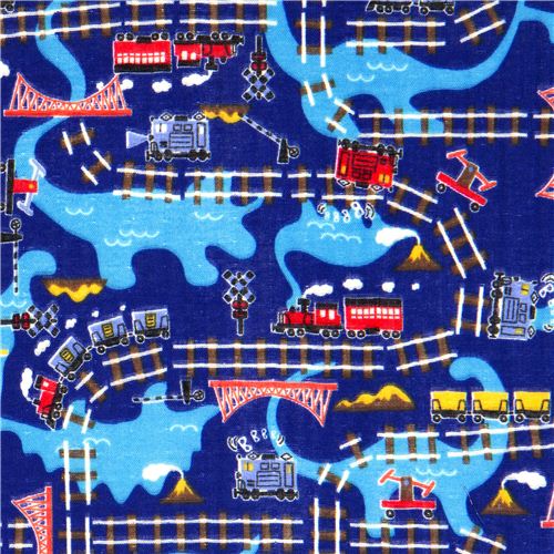 dark blue fabric with trains, locomotives, tracks and seas in the shape of dinosaurs