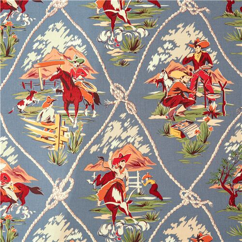 by Alexander HenryRoping Rach Scenic USA Cowboy Fabric. blue fabric with cactus, mountain, fireside cooking, buckaroo fabric from the US, 100% cotton quality printing and good quality as usual from Alexander Henry