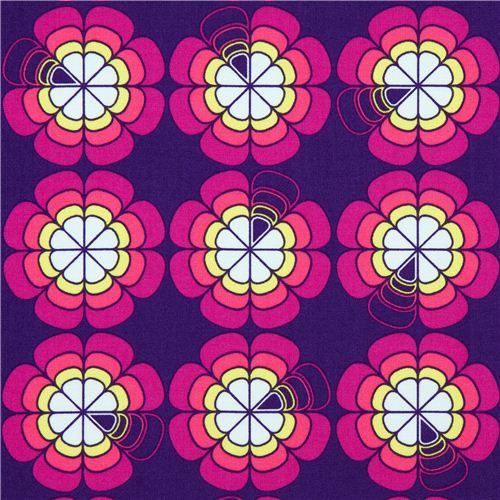 tela morada de algodón con muchas flores verdes, naranjas y amarillas