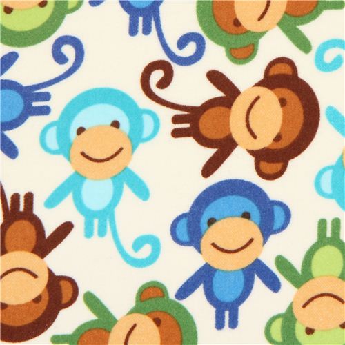 suave tela de franela blanca con monitos en azul, verde, turquesa y marrón