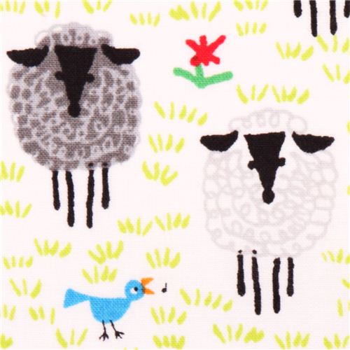 tela de algodón blanco con ovejas, hierba, flores y pájaros