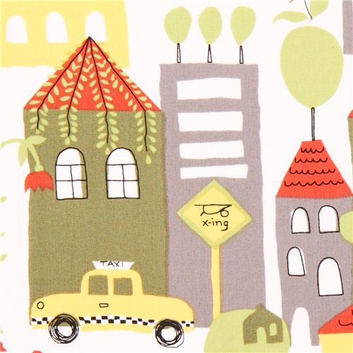 tela de algodón blanco con casas, coches, árboles, flores, etc.