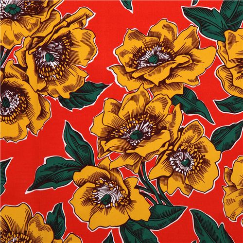 tela roja de algodón con grandes amapolas amarillas