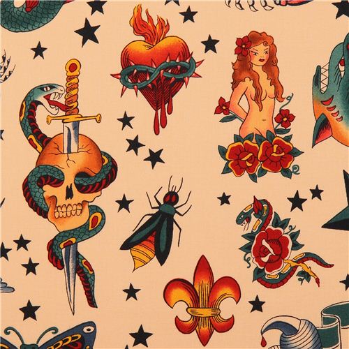 de Alexander HenryTela con calaveras. Fabricado en Japón tela beis de algodón con calaveras, estrellas, rosas, dados, tiburones, serpientes, corazones, mariposas, pájaros, escorpiones, etc. tejido de máxima calidad, con la categoría típica de Alexander Henry