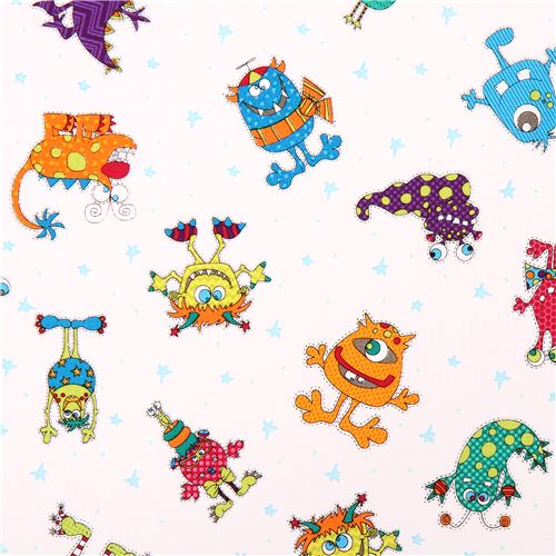 tela de algodón blanco con graciosos monstruos de colores y estrellitas