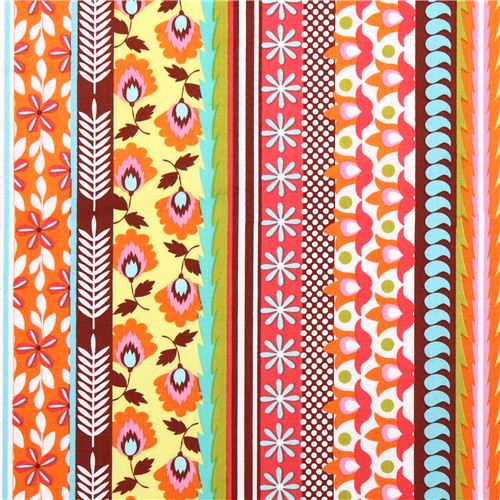 preciosa tela multicolor de algodón en marrón y naranja, con bandas de estampados florales de distinta anchura y diseño oriental