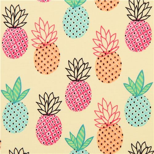 tela amarilla de algodón con ananás en rosa, verde y naranja