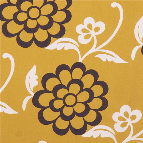 tela de algodón amarillo con grandes flores marrón grisáceo y hojas blancas
