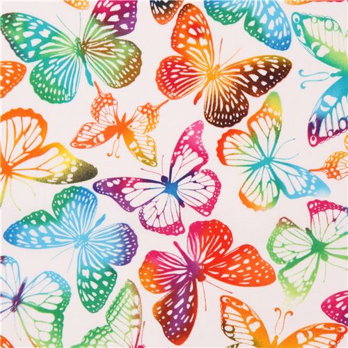 tela blanca de EE. UU. con mariposas multicolores en azul, violeta, verde, amarillo, rojo, etc.