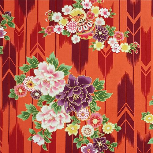 17 Tela japonesa naranja con dorados metalizados flores peonías de Quilt Gate Fabric by Cosmo - modesS4u