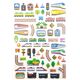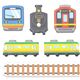 pegatinas de trenes en azul, amarillo, verde, blanco, violeta y otros tonos con vías, conos de señalización, etc.