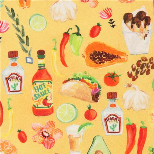 Tela amarilla de comida de Dear Stella tela de algodón amarillo crema con aguacates, flores, papayas, chiles, limas, tacos, churros. etc.