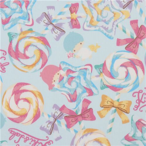 de SanrioTela oxford azul con caramelos y Little Twin Stars tela oxford azul claro con Lala, Kiki y piruletas de caramelo amarillas, rosas, violetas, etc. con lazos