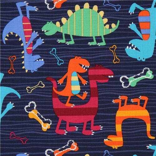 Tela azul de dinosaurios de Michael Miller tela azul marino con dinosaurios T-Rex, estegosaurios, huesos, etc.,en verde lima, naranja, amarillo y otros colores