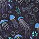 tela azul oscuro de algodón con criaturas marinas de colores: medusa, anguila, calamar, etc.