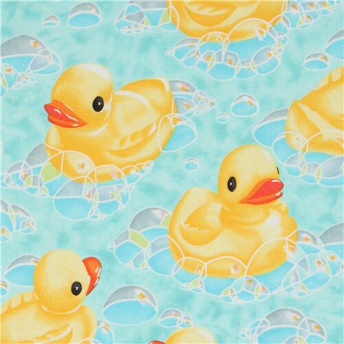 Tela turquesa de patos de goma tela turquesa con patitos amarillos y burbujas