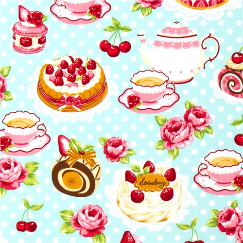 Tela muy mona con tartas, trozos de pastel, tazas de café y rosas, importada de japón