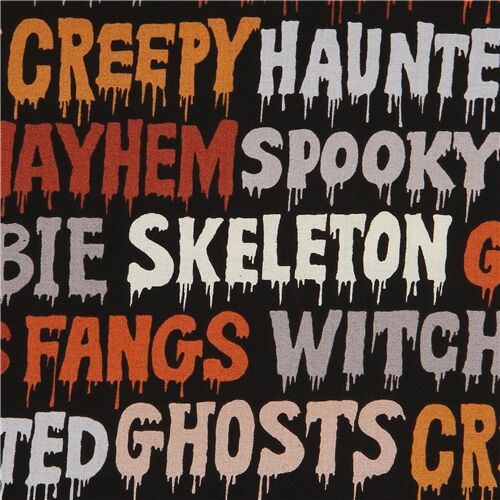 de Alexander HenryTela con palabras en inglés sobre Halloween tela negra con palabras como 'Vampire', 'Tricks', 'Ghosts', etc. en marrón, beis, gris y otros tonos