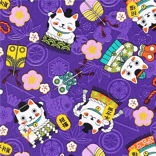 Tela violeta de iconos japoneses gato de la suerte Trans-Pacific Textiles Tela