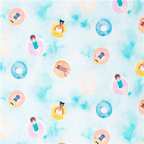 Tela de niñas y gatos con círculos Dear Stella graciosa tela veraniega de algodón con chicas en bañador y gatos descansando en flotadores de colores sobre fondo azul claro