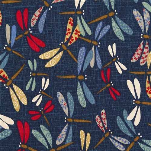 33,26 Tela tramada de sábana de Japón algodón azul oscuro con libélulas de colores Fabric by Japanese Indie - modesS4u