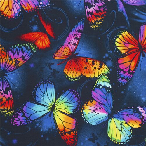 33 Tela de mariposas arcoíris algodón negro y azul de Timeless Treasures Fabric by Timeless Treasures - modesS4u