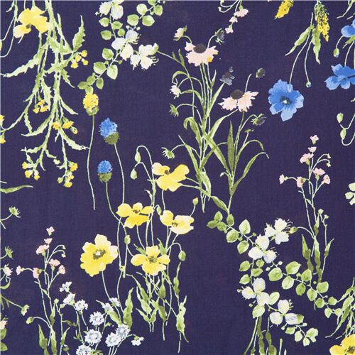 de HokkohTela de batista azul marino con flores silvestrestela de algodón azul marino japonesa con flores de pradera en amarillo, rosa y azul con hojas y tallos verdesespecialmente importado de Japón, de pequeños productores, 100% algodóntejido de máxima calidad, con la perfección típica de los productos japoneses