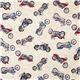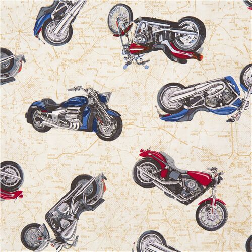Tela de motocicletas vintage rojo plata azul sobre mapa beis Timeless Treasures Tela
