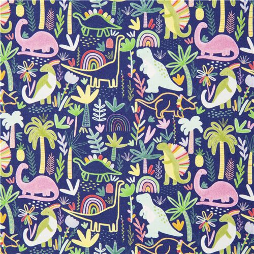 7 Tela azul oscuro de dinosaurios de colores Dear Stella arcoíris plantas flores Fabric by Dear Stella - modesS4u