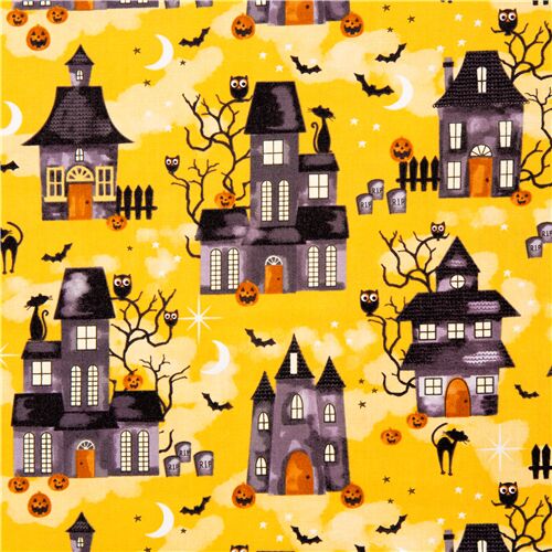 8 Tela amarilla de algodón Michael Miller calabaza murciélago casa encantada gato Fabric by Michael Miller - modesS4u