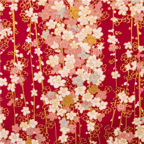 5,30,46 Flores sakura rosa gris blanco dorado metálico tela roja algodón suave de Japón Fabric by Cosmo - modesS4u