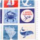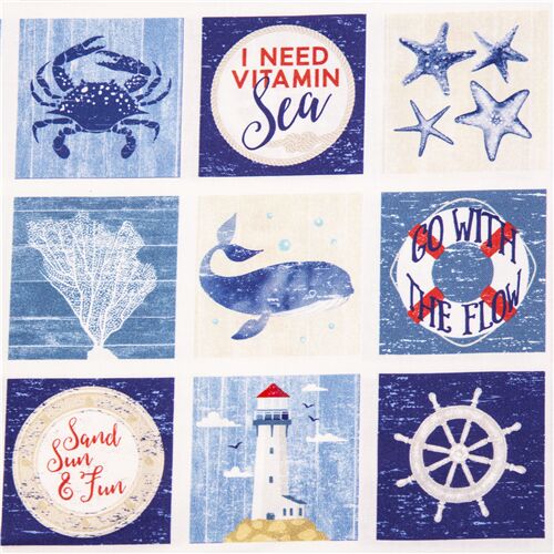 de Michael MillerTela EE. UU. recuadros del mar con cangrejo ballena azules tela de algodón blanco, azul y rojo con motivos de la costa en recuadros, incluye animales y frases como 'go with the flow', estrella de mar, coral, ballena, cangrejo, ancla, faro, timón, etc. tela americana de EE. UU. 100% algodón, con la gran calidad propia de Michael Miller