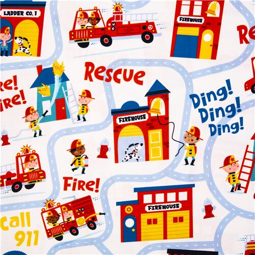 de Michael MillerBomberos al Rescate Mapa USA Fabric. niños impresos en tela de algodón blanco con edificios rojos, azules y amarillos y vehículos de emergencia en un mapa incompleto con calles azules, bomberos coloridos, escaleras y textos relacionados tela de EE. UU., 100% algodón, buena calidad como siempre de Michael Miller