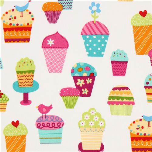 tissu en coton blanc avec plein de coupes de glace multicolores et des petits gâteaux cupcakes